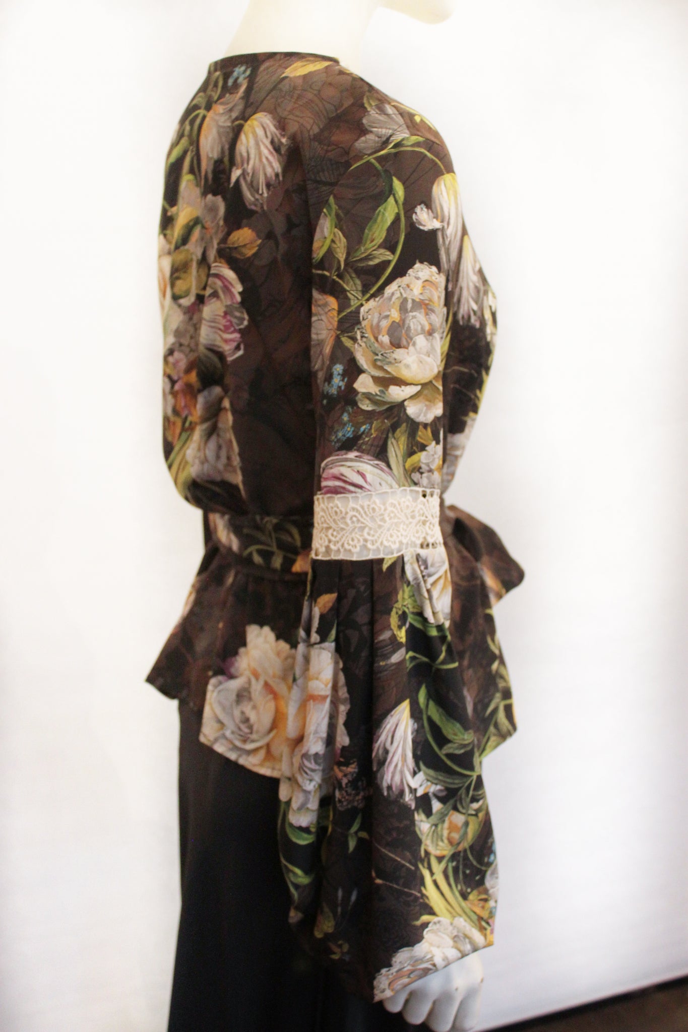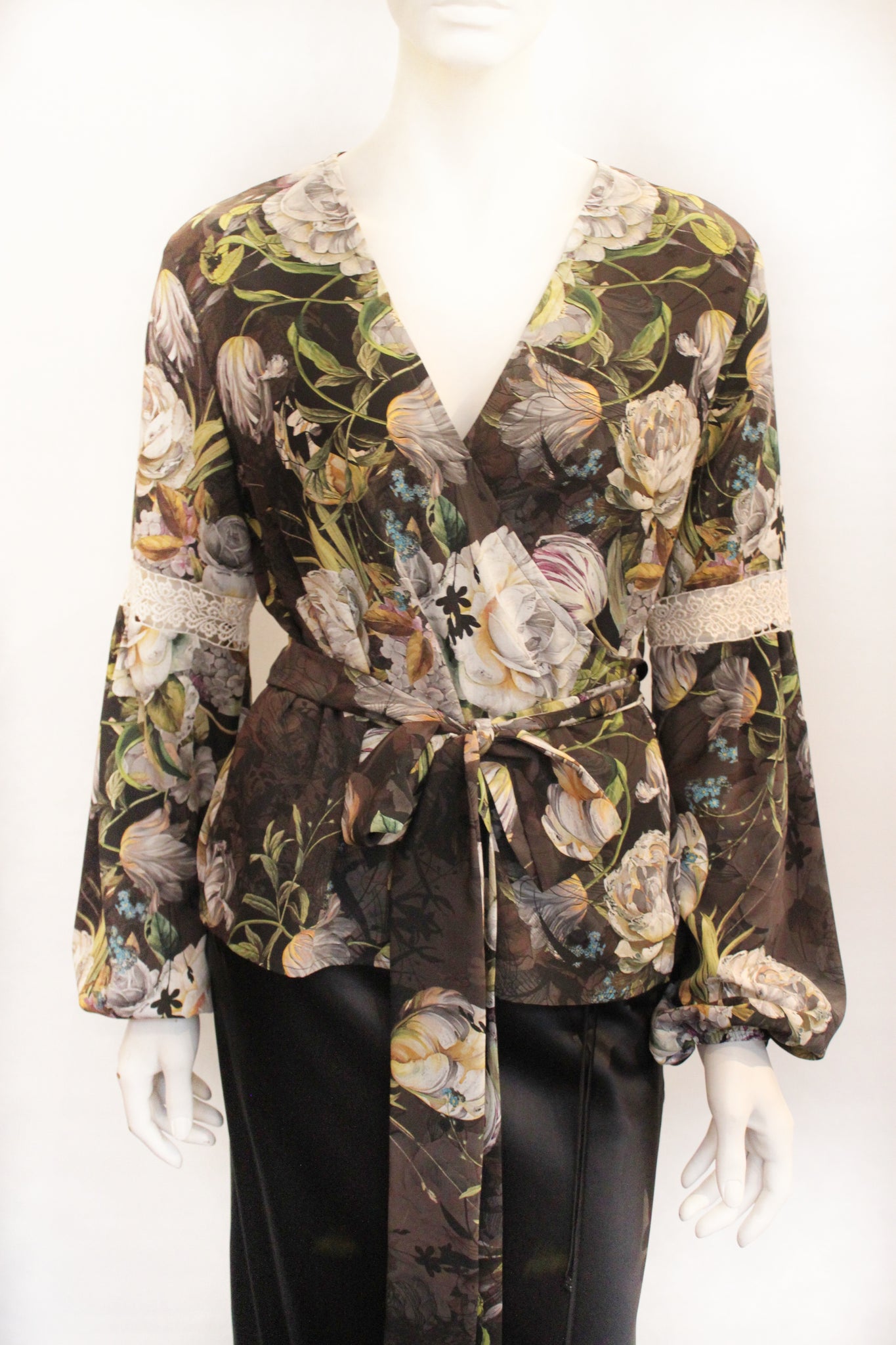 Bluse i 100% silke, med bomulls blonde detalj på erme. Passer en medium størrelse,men kan gå litt opp og ned i str pga omslag.