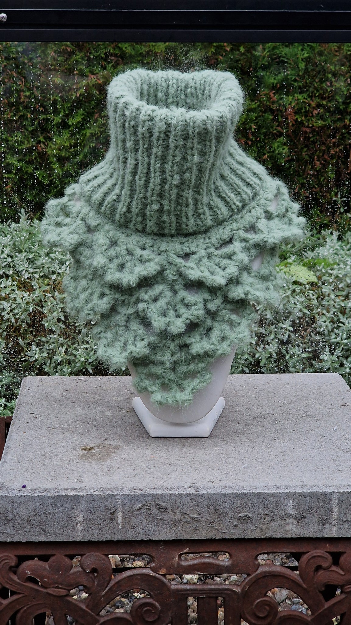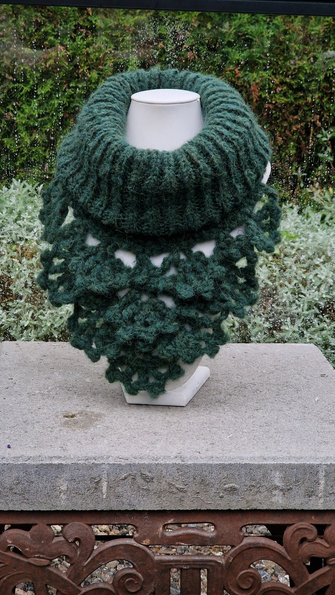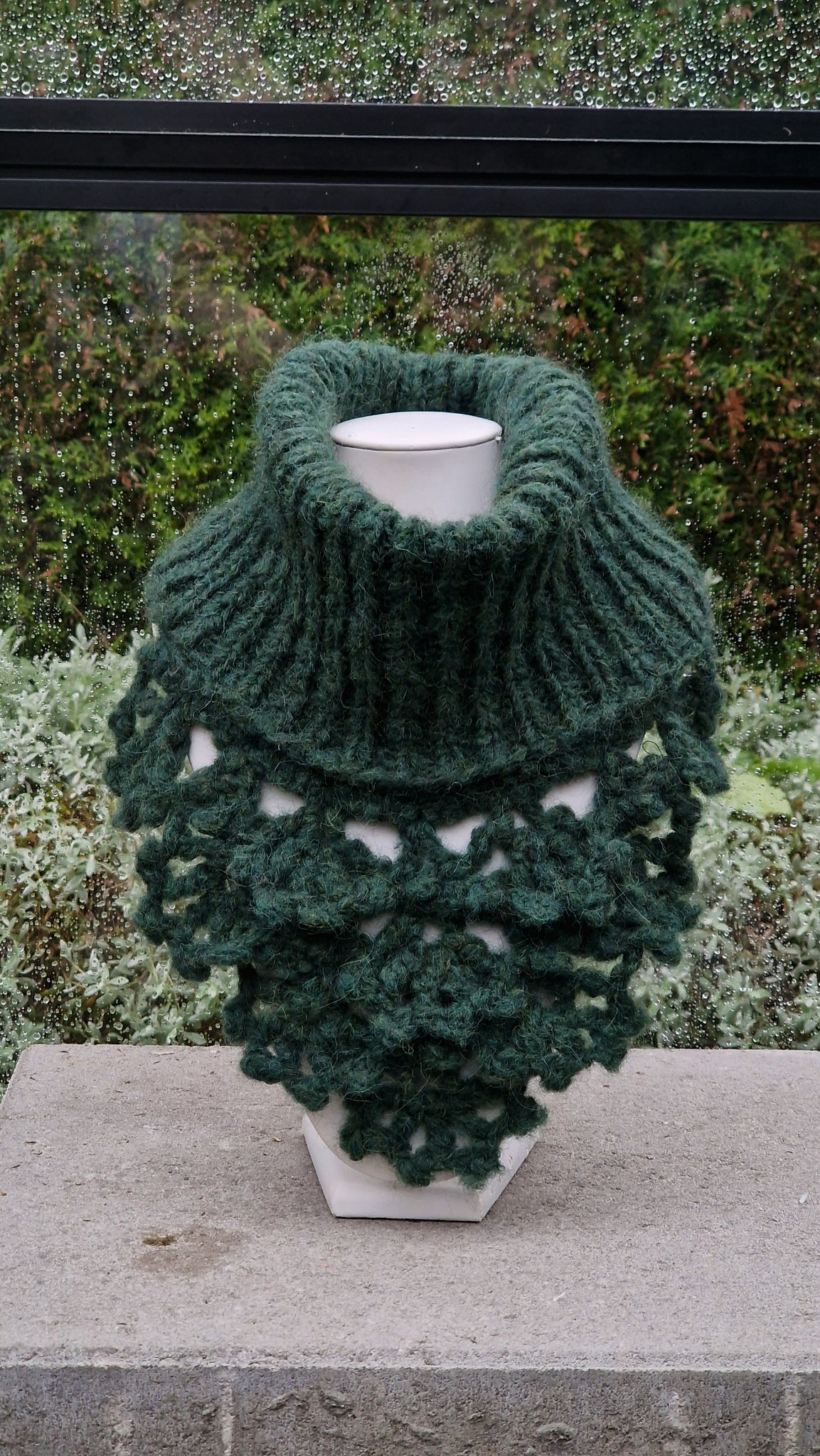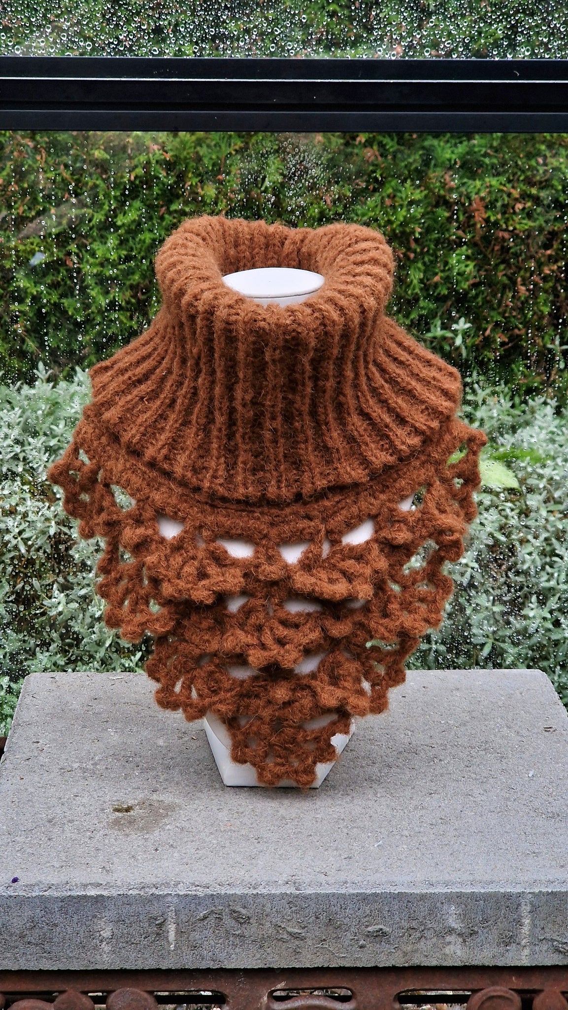 Hals strikket og heklet i alpakkagarn. Høyde på hals er ca 12-13 cm dobbelt. Kan også brettes ytterligere, så den blir 7 cm ca, som siste bildet. Bredden er elastisk i rett og vrangstrikk.